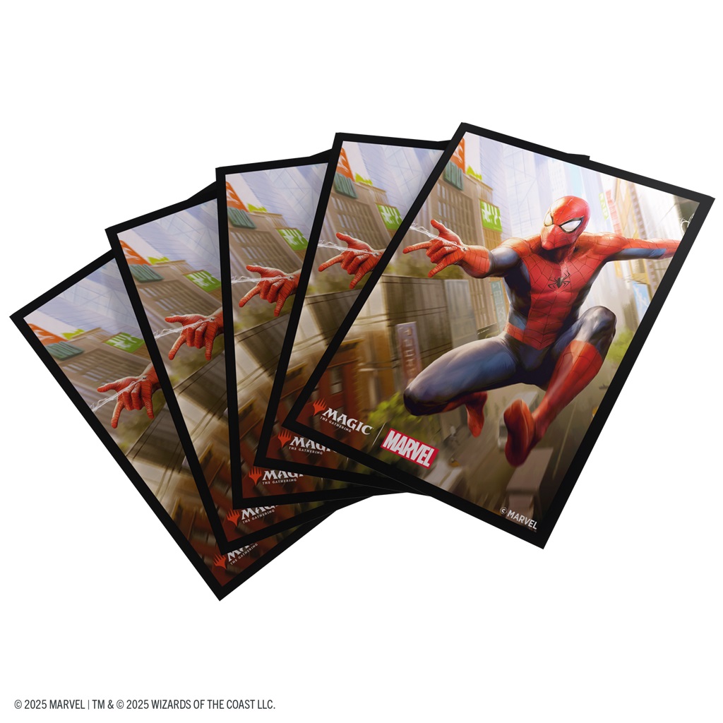 MAGIC MARVEL SPIDERMAN SLEEVES SPIDERMAN. Mejora tu juego y protege tus cartas con estilo. Estas fundas ilustradas Art Sleeves impresas a todo color, de gran calidad y con acabado texturizado, son imprescindibles para todos los fans del juego. La textura mate del reverso y la transparencia del anverso brindan una sensación táctil excepcional y una experiencia al barajar increíblemente suave. Cada paquete incluye 105 fundas y viene en un embalaje ilustrado totalmente libre de plásticos con un gancho retráctil.