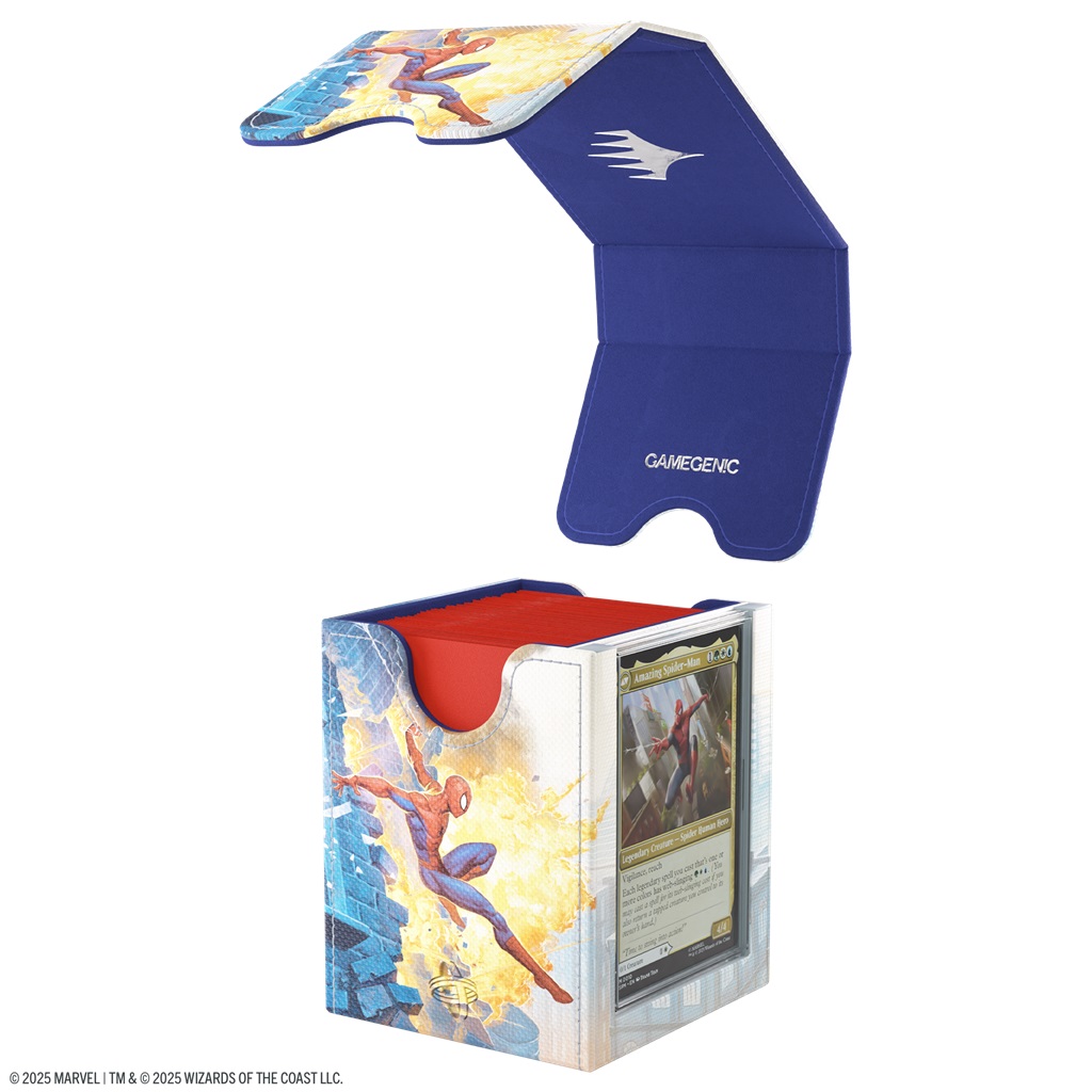 MAGIC MARVEL SPIDERMAN SQUIRE PLUS 100+ XL. La Art Squire PLUS 100+ XL es una caja para mazos de gran calidad que incluye ilustraciones con licencia oficial del juego, impresas en una superficie de Armorfyber a todo color con un alto impacto visual. Esta caja es muy innovadora: podrás ver tu carta superior o tu carta Commander sin abrir la caja. La funda Slide Card Case incluida mantiene tu carta protegida de los rayos UVA y, además, te permite identificar el mazo guardado fácilmente sin abrir la caja. También la puedes extraer y usarla durante el juego. La caja puede contener hasta 100 cartas en doble funda, particularmente aquellas con fundas interiores gruesas. También puede contener hasta 100 cartas en doble funda normal, con espacio adicional cartas de ficha. Esta caja prémium también está equipada con nuestro valorado sistema convertible: la tapa extraíble se acopla a la parte inferior y ahorra un espacio considerable en la mesa de juego.