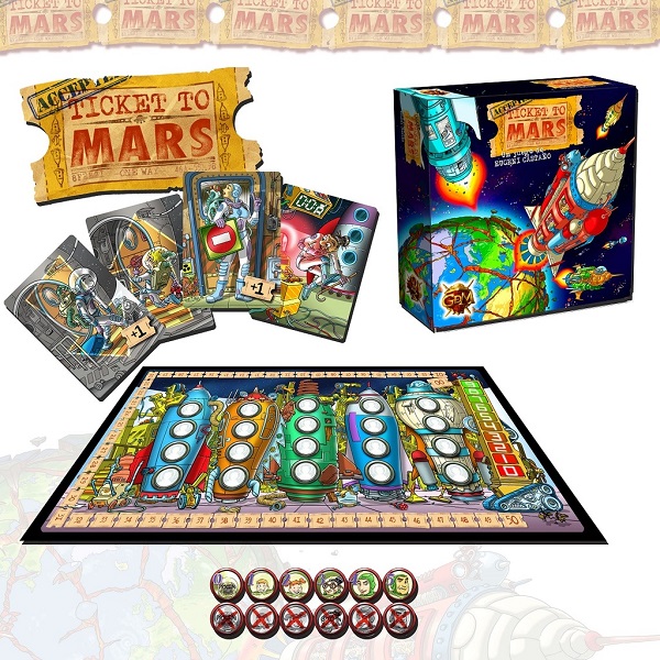 TICKET TO MARS. La Tierra está a punto de ser destruida, pero la humanidad ha conseguido construir algunas naves para transportar parte de la población a Marte. No hay sitio para todos, solo algunos afortunados tendrán su Ticket. Cada jugador forma parte de una mega-corporación con distintos intereses, aquel que consiga cumplir más objetivos será el ganador. Sube, mueve y baja personajes de los cohetes para conseguir tus objetivos mientras el contador de lanzamiento llega a cero.